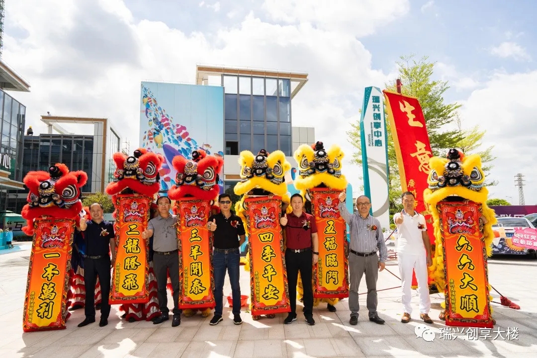 廣東瑞興醫(yī)藥股份有限公司董事長黃凌云先生與一眾嘉賓領(lǐng)導(dǎo)為【瑞興創(chuàng)享中心】開放典禮進(jìn)行剪彩儀式,并在眾多賓客矚目下,6位領(lǐng)導(dǎo)上前為6只舞動(dòng)的瑞獅點(diǎn)睛。