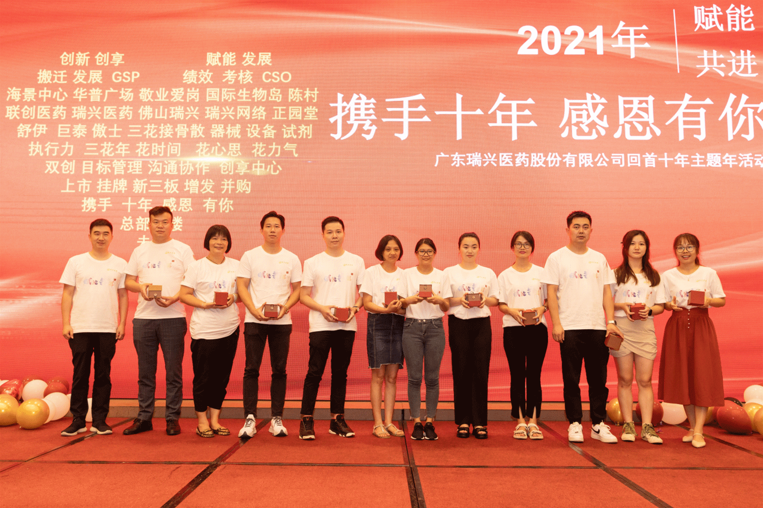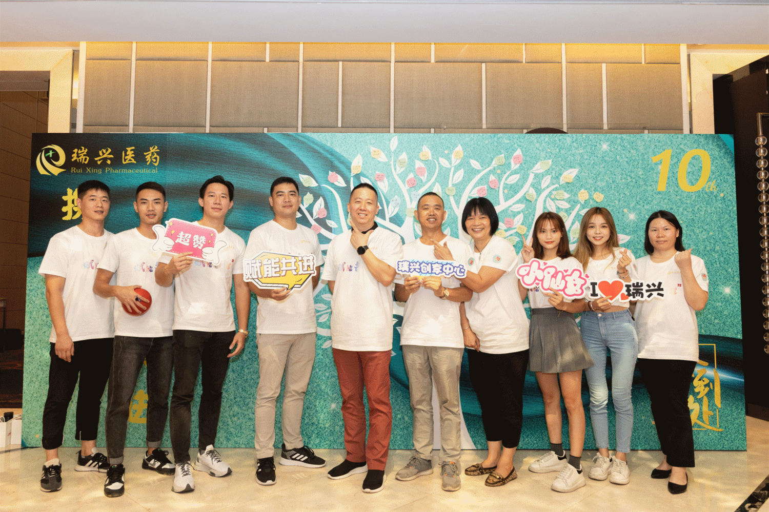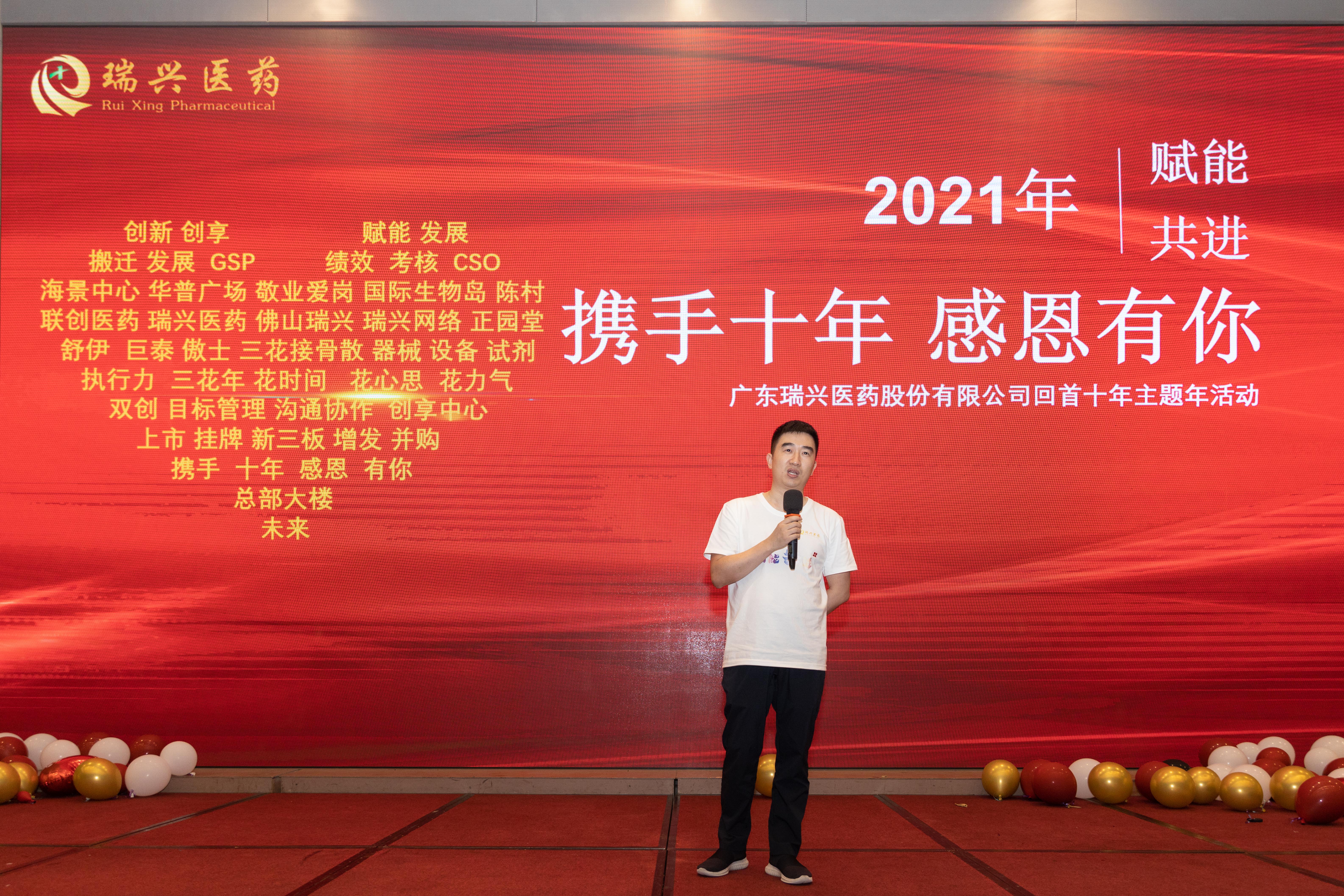 “攜手十年,感恩有你”,瑞興醫藥十周年暨主題年回顧活動于2021年7月18日下午在北滘鉑爾曼酒店順利舉行并取得了圓滿成功。從門口的簽到墻,到整齊擺放的瑞興令和統一的服裝,每一個環節都充滿了紀念的意義。本次活動中公司董事長黃凌云先生、總經理欒廣根先生、副總經理周益先生以及營銷中心總經理陳廣明女士應邀出席。活動現場在瑞興全體員工的見證下回憶滿滿,感慨萬千。