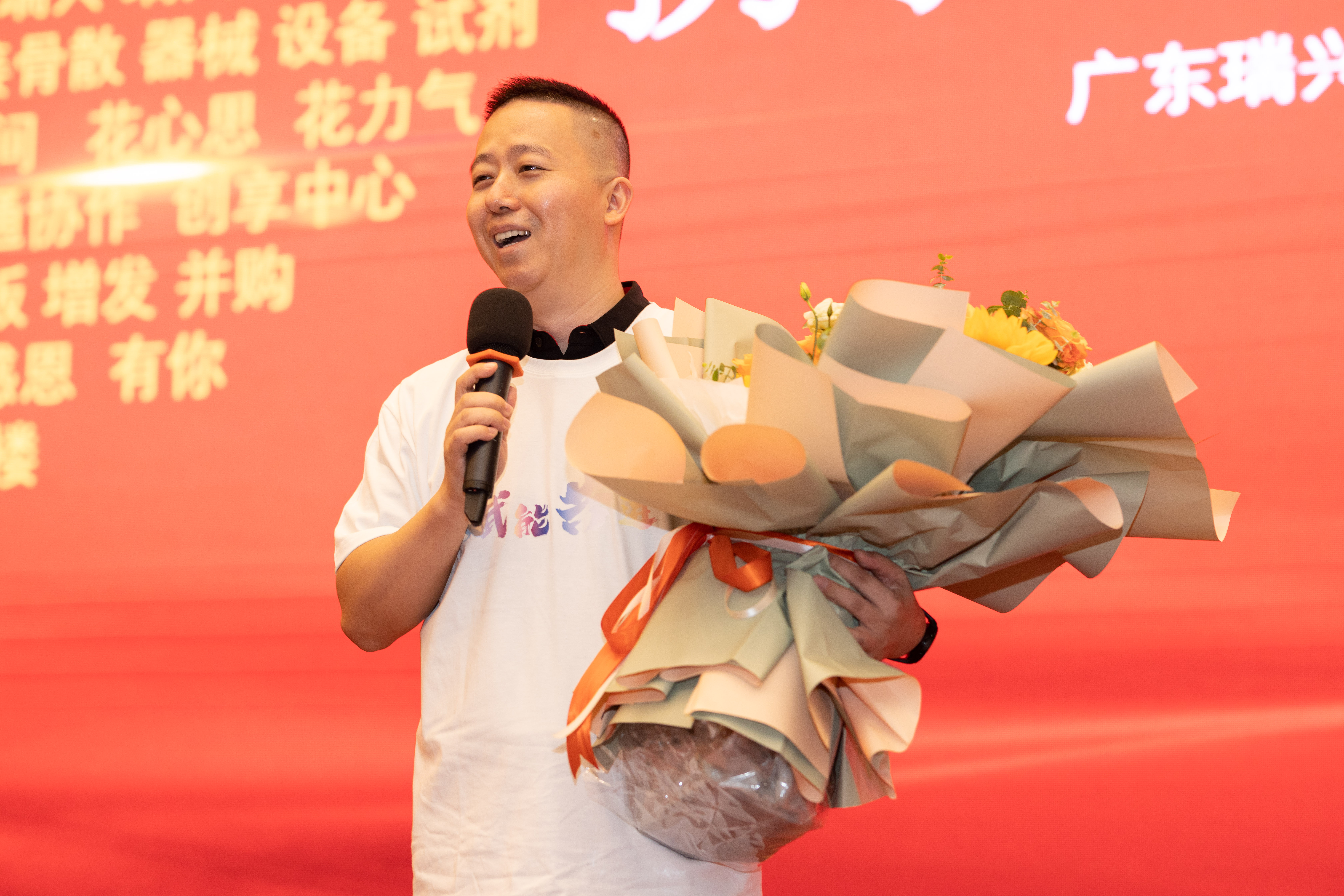隨后,周益副總經理現場作了一首詩,周公子的稱號名不虛傳,欒廣根總經理回憶了和黃董十多年來戰友般的情誼,緣分讓我們凝聚在一起,共同的目標造就了一支“拉得出、打得響”的團隊;最后,黃凌云董事長跟我們講述了他這么多年來的回憶,當過兵、創過業,闖闖蕩蕩,最終和欒總一起攜手創辦了如今的瑞興醫藥。十年相守不易,除了同事的身份,我們更是一家人。
